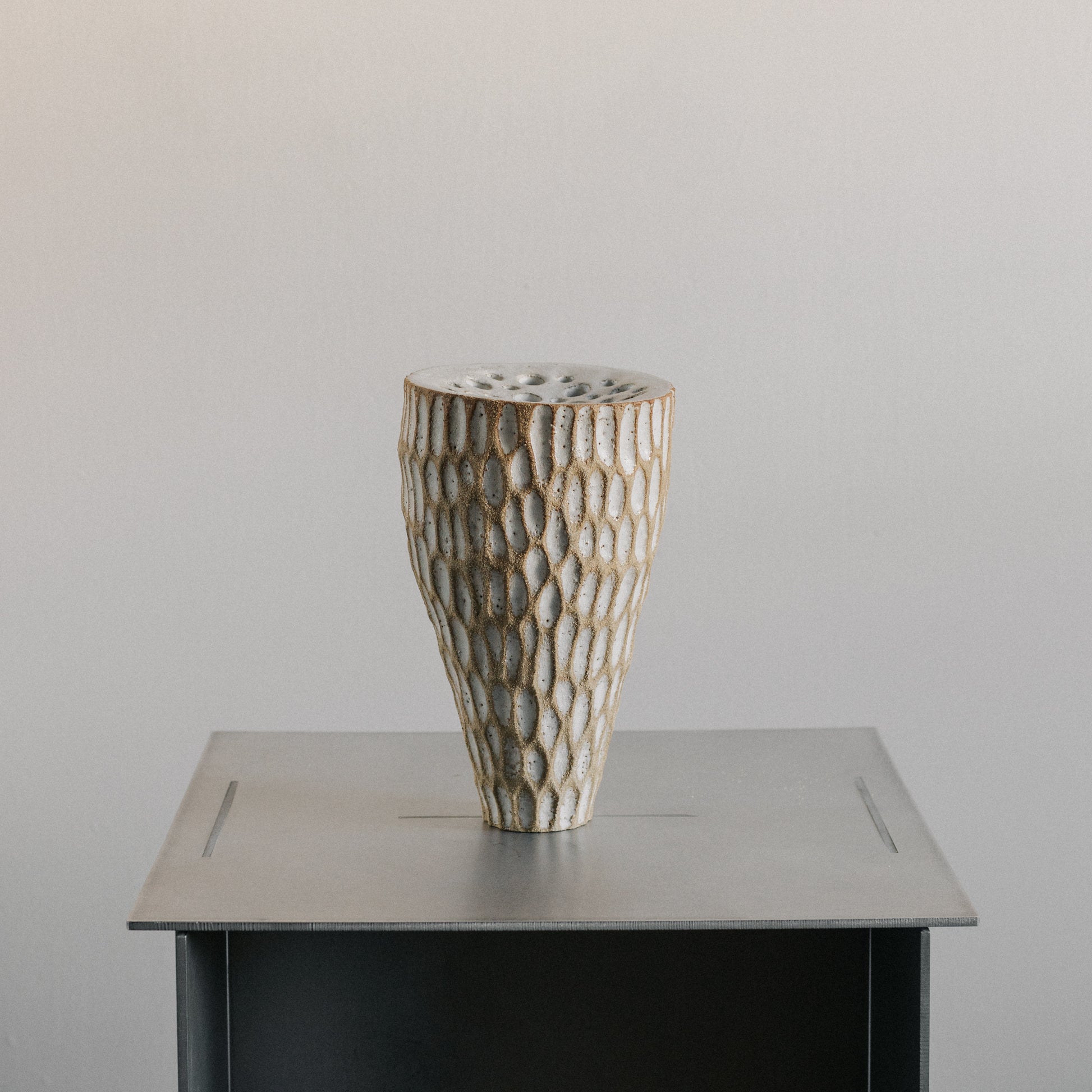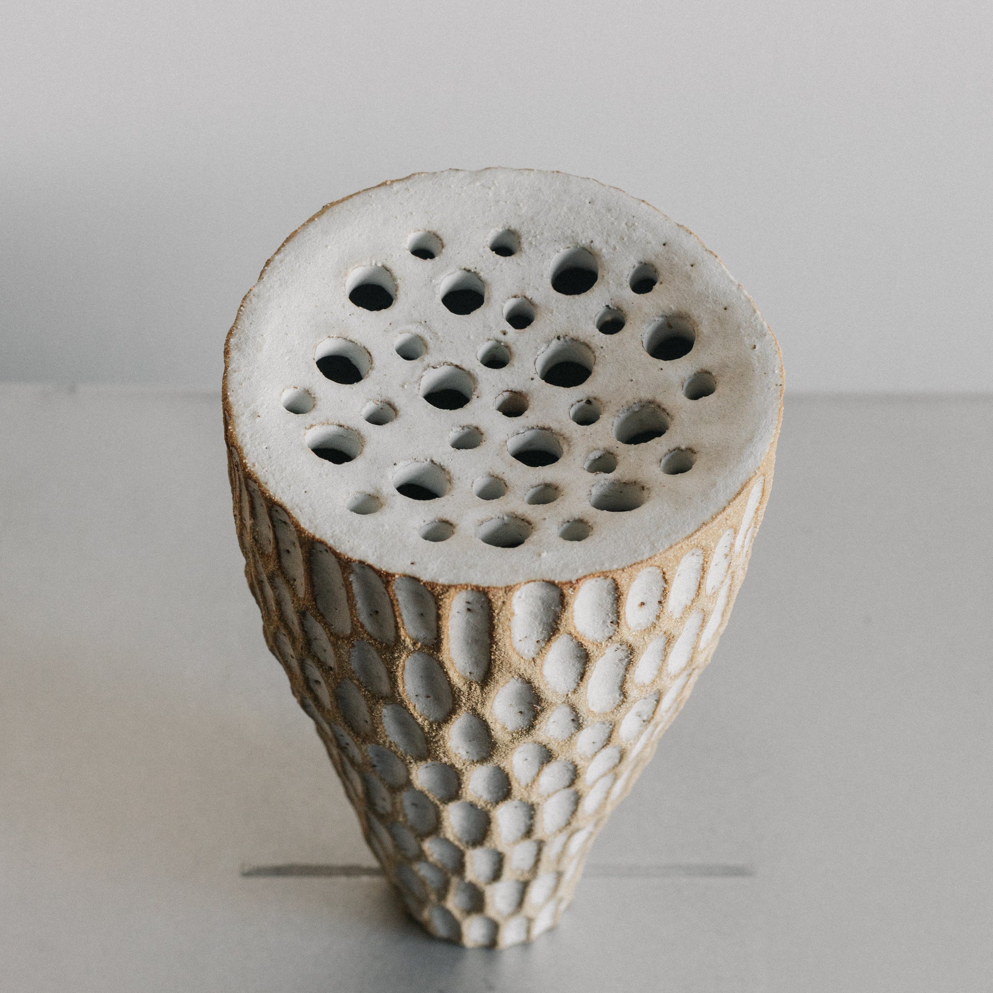 Inspired by natural textures and the philosophy of modern ikebana, this vessel invites a tactile exploration of form and feeling. Its surface carries texture that nods to the natural world - abstract yet familiar. The top includes small openings designed to support delicate stems and encourage thoughtful arrangements.