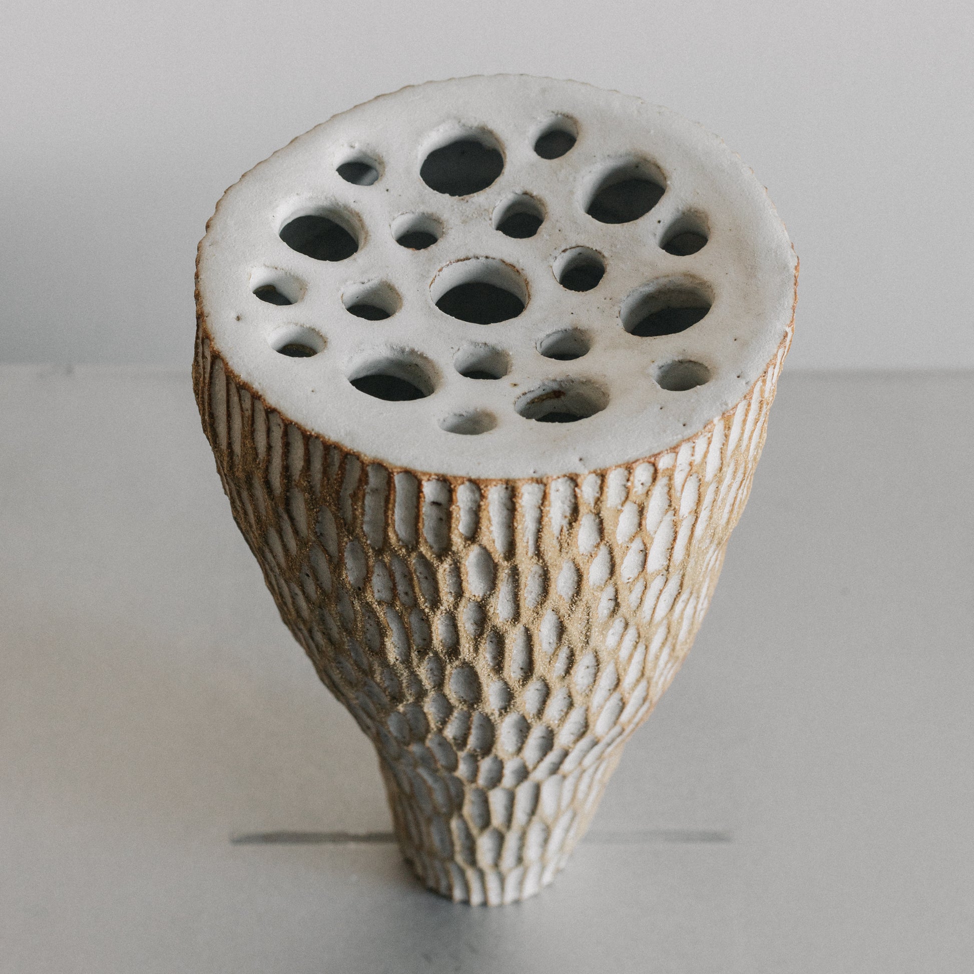 Inspired by natural textures and the philosophy of modern ikebana, this vessel invites a tactile exploration of form and feeling. Its surface carries texture that nods to the natural world - abstract yet familiar. The top includes larger openings designed to support stems and encourage thoughtful arrangements.